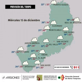 Provinciales Miércoles con una jordana calida y húmeda Jornada nuevamente cálida y húmeda. Una extensa región de baja presión favorece inestabilidad y tormentas sobre sectores de Córdoba, sur y centro del Litoral. Mientras tanto, en Misiones aumentaría notablemente la nubosidad poco antes del mediodía, situación que se extendería a la tarde, no obstante, no se esperan lluvias. Precipitaciones: no se esperan. Probabilidad de precipitación: 0/20 %. Probabilidad de nieblas y neblinas: alta. Vientos: predominantes del norte y noreste. Velocidades entre 6 y 19 km/h. Probabilidad de ráfagas de entre 20 y 50 km/h. Calidad del aire: buena. Temperaturas: máxima en la provincia estimada en 35 °C para Apóstoles con 42 °C de sensación térmica; la mínima sería de 19 °C en Bernardo de Irigoyen. 13/12/2023 • 07:45 Compartir en FacebookCompartir en TwitterCompartír en LinkedinMás Provinciales Ultimas Notas en Provinciales